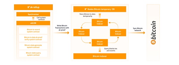 zkEVM 兼容以太坊虚拟机(EVM),帮助开发人员构建安全的 DeFi、NFT 和其他 DApp。它还支持将 DApp 从其他 EVM 兼容链迁移到 B² Network。zkEVM 与 B² Network 的比特币索引模块结合,存储比特币的状态数据,使开发人员能够将比特币网络集成到 DApp 开发中。