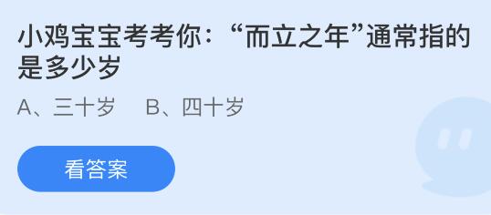 小鸡宝宝考考你:“而立之年”通常指的是多少岁?这是2024年蚂蚁庄园1月29日今日庄园小课堂的问题,下面为大家详细介绍2024年1月29日今天蚂蚁庄园课堂小鸡饲料答案。