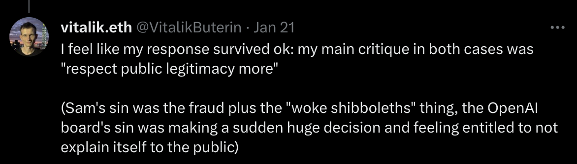 其次,谈及OpenAI董事会的行为,V神提出了类似的观点。在这个情况下,董事会突然做出重大决策并且似乎认为他们无需向公众解释。这在V神看来,同样是对公众合法性的忽视。他认为,无论决策的内容如何,公开透明和对公众负责是极为重要的。