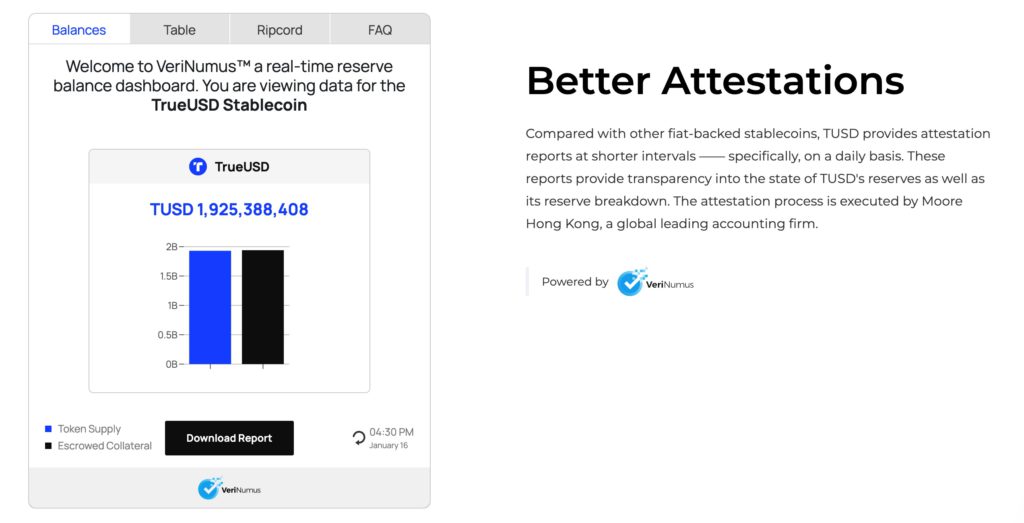 根据TureUSD官网1/16更新的储备证明,目前TUSD具有101%的抵押。不过官方当前使用的似乎是一款名为Veri Numus的自动化审计系统,但指出鉴证流程是由Moore HK执行。