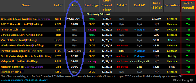 首先,Nate Geraci将优先关注剩余发行商的费用公开。特别是贝莱德和灰度,在这场竞争中,他认为费用的重要性不可低估,富达目前以0.39%的费率**,Invesco的费率为0.59%(不过在首6个月内免费)。