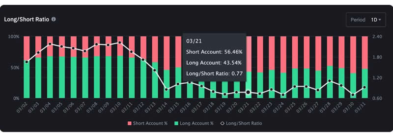 以2023年3月21日BTCusdt永续合约的多空比为例,在图表中,将每个柱子的时间周期设置为1天,该图表展示了过去30天的数据,可以看出多空比为0.77,即所有BTCUSDT未平仓头寸的币安合约账户中有56.46%为净空头头寸,而其余43.54%为净多头头寸。