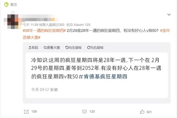 2月29日消息,微博话题“28年一遇的疯狂星期四”引发热议。