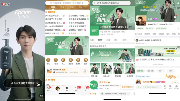 3月4日0点,雨洁品牌代言人王源的态度大片,相继登陆新浪微博、抖音等平台开屏,连上多个热搜,排面拉满,#王源代言雨洁去屑洗发水#的话题讨论度**,在各大APP花式刷屏出圈,引发**热议。