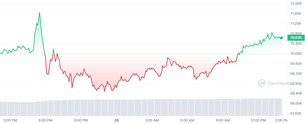 基于这一前景,如果比特币的价格保持在7万美元以上,它可能会上涨约10%,达到7.7万美元的历史新高。在加密货币前景乐观的同时,比特币在前24小时内上涨了1.23%。