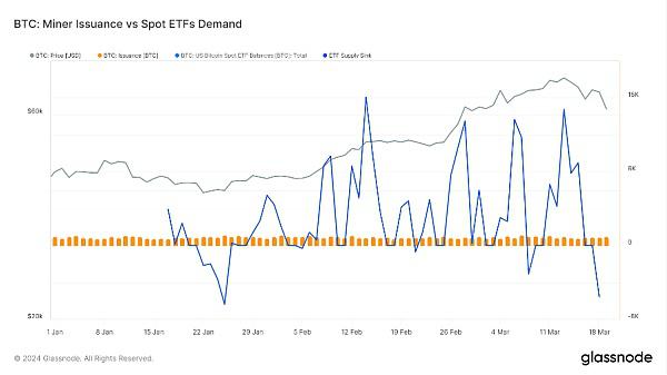 BTC这轮周期有什么不同?随着减半的临近,与ETF不断增长的需求相比,新开采并释放到流通中的BTC的影响变得越来越小。ETF从市场上撤出的数量是每天铸造的BTC数量的几倍。目前矿工每天向市场带来大约900个BTC。减半后将下降至 450个BTC,在过去的市场条件下,这可能会加剧BTC的稀缺性并推高价格。