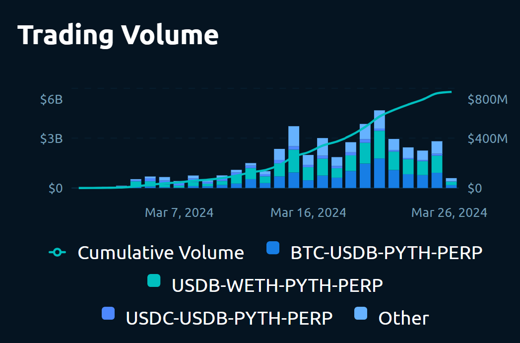而 3 月 1 日,SynFutures V3 平台在 Blast 主网正式上线,交易量一路走高,3 月 21 日更是创下 6.23 亿美元的历史新高记录,截至 3 月 26 日,仅 V3 版本的累计交易量就接近 58 亿美元。