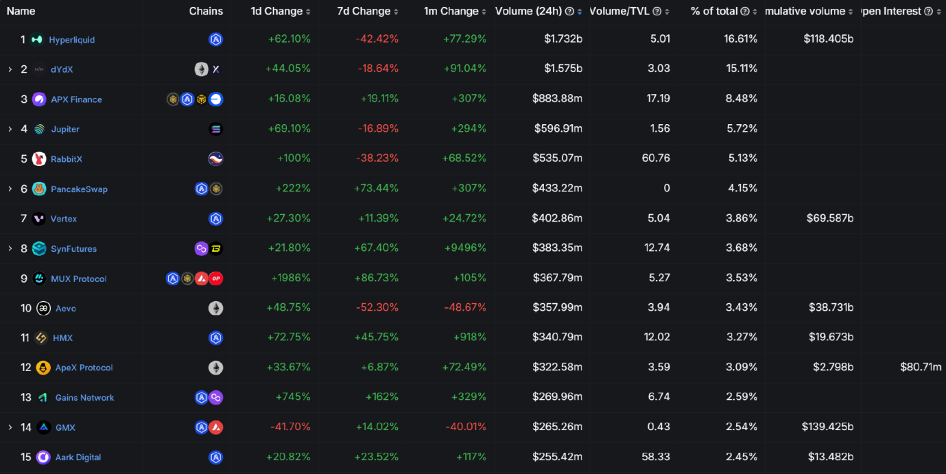 - 月度维度上,作为龙头的 dYdX、Hyperliquid 增速分别为 77% 和 91%,而 Synfutures 同期为超 9400%;