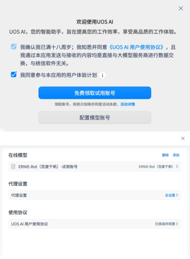 如果你已经拥有以上的大模型账号,通过点击主程序界面右上角“菜单”-“设置”选项,在设置界面内添加你的大模型账号后即可使用。如果你尚未拥有自己的大模型账号,不用担心,UOS AI还为你提供了免费的试用账号,你只需要在设置菜单中点击“申请试用”即可免费获取一个百度大模型账号。