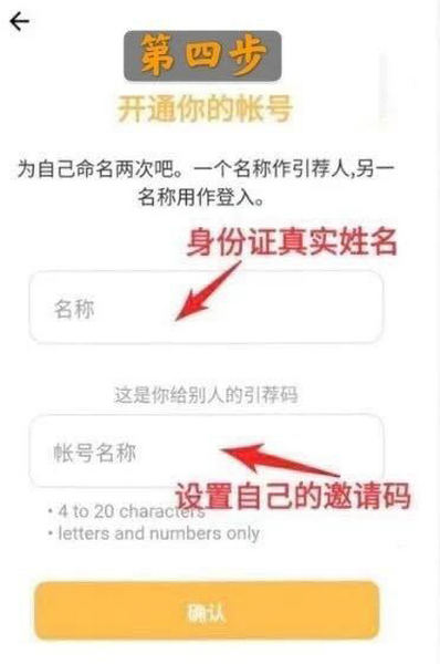 4.输入自己身份证上的名字,因为后期可以交易时会需要实名认证,下面一行的是自己的账户名也即邀请码,自己设定4-20个数字或字母即可: