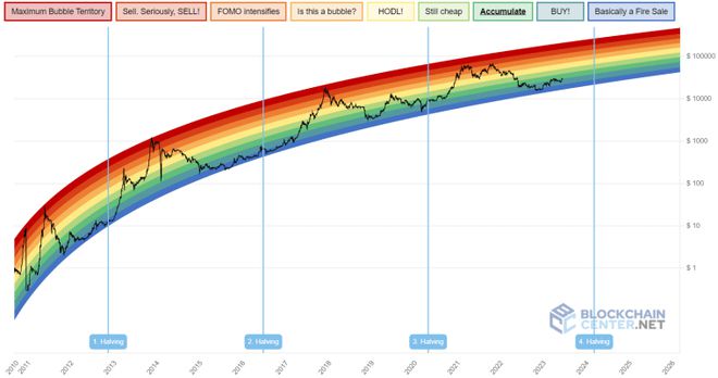 **,Blockchaincenter.net 流行的比特币彩虹图显示,在目前的水平上,比特币处于“买入!”状态。区,最近刚刚从 2022 年底的“基本上是甩卖”区中恢复过来。