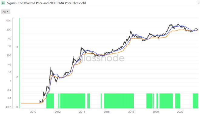 比特币的交易价格轻松高于前两项 200 日均线和已实现价格。