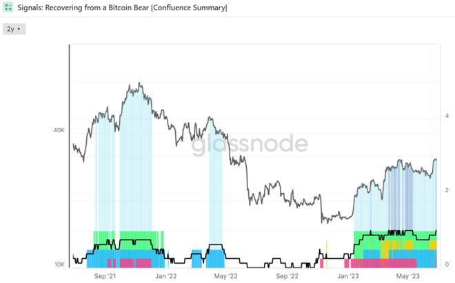 以链上分析公司Glassnode 广泛关注的“从比特币熊市中恢复”仪表板为例,该仪表板包含八个链上和技术指标。