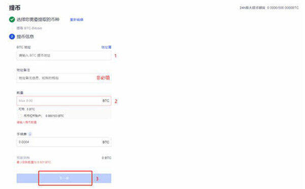 3. 填写提现信息,输入提现地址和数量,点击下一步即可。