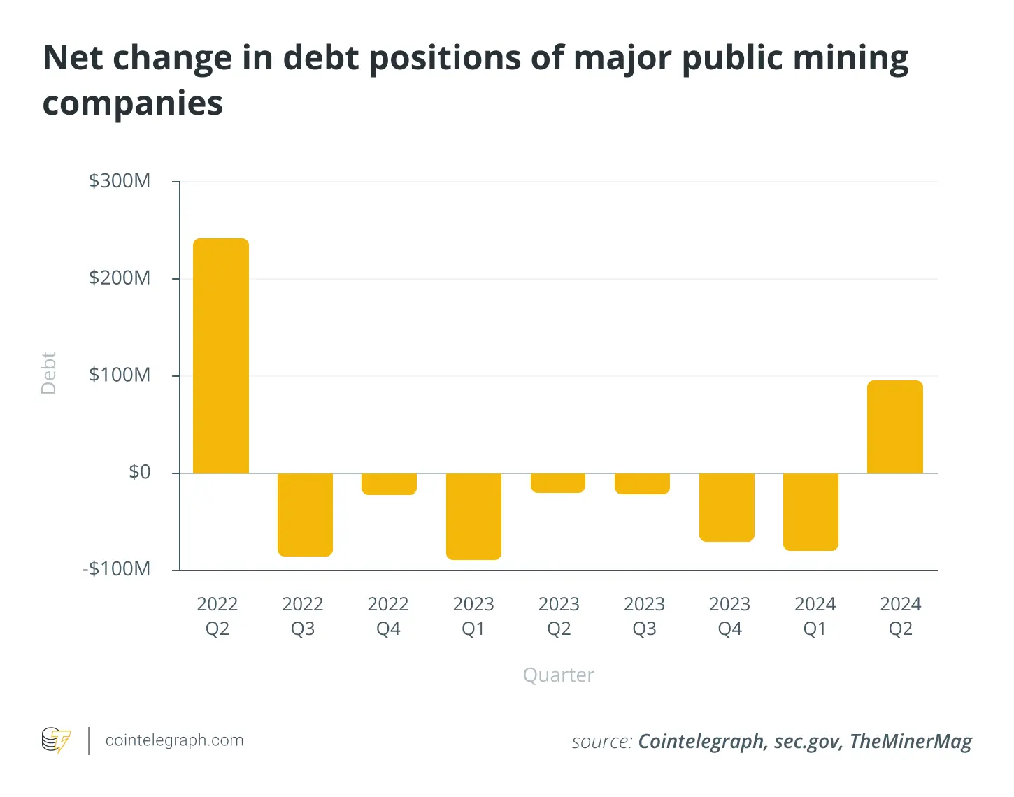 2022 年的加密货币寒冬导致主要的比特币矿工因过度依赖债务融资而申请破产。大多数上市矿工的债务与股本比率超过四,而超过二通常被认为是不可持续的。从 2022 年第三季度开始,比特币挖矿行业开始清理**。**的例外是 2024 年第二季度,由于对 Hut 8 的 1.5 亿美元投资,使得该季度的数据有所偏差。
