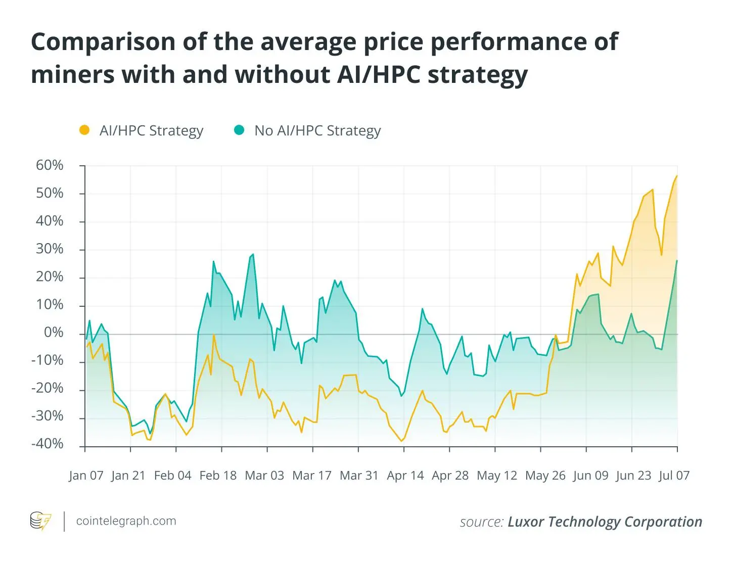 采用 HPC 和 AI 策略的公司,其估值增长超过那些未采用 HPC 和 AI 策略的公司。截至第二季度末,参与 AI 和 HPC 的矿工的股票价值较年初增长了 25%,而传统矿工则下降了 3%。