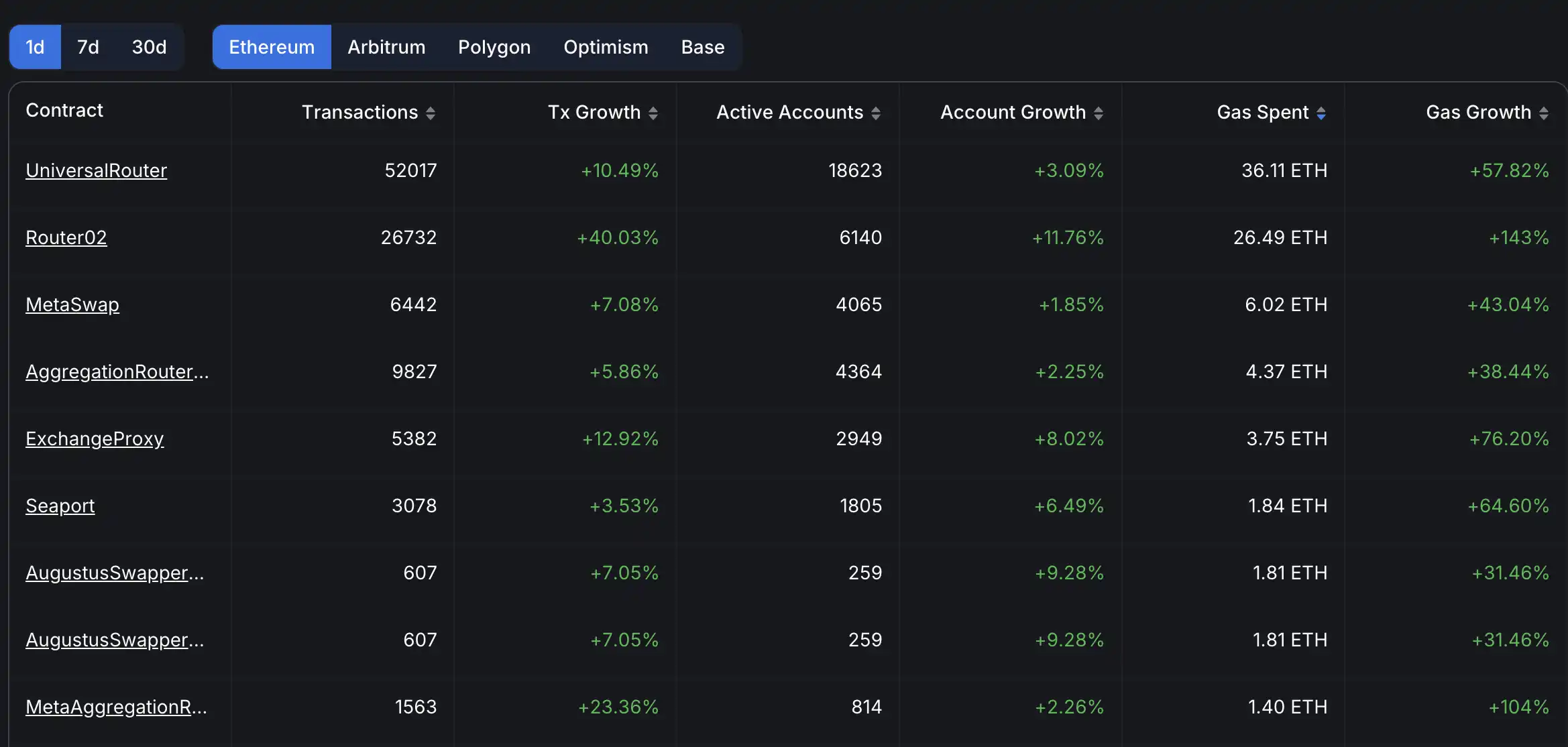 以太坊生态每日合约动态观察,按 Gas 消耗增速及部署时间筛选并排列