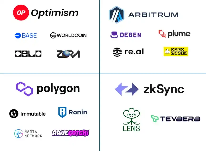 行业对齐举措包括通过开源 L2 技术栈(Rollup 框架)允许新玩家构建自己的链。这一波举措最初由 Op Rollup 通过 OP Stack 和 Arbitrum Orbit 的推出**,其他成熟的 L2 如 Polygon(Polygon CDK)、ZK Sync(ZK Stack)和 Starkware(Madara Stack)也紧随其后,通过开源其专有技术推动大规模应用。