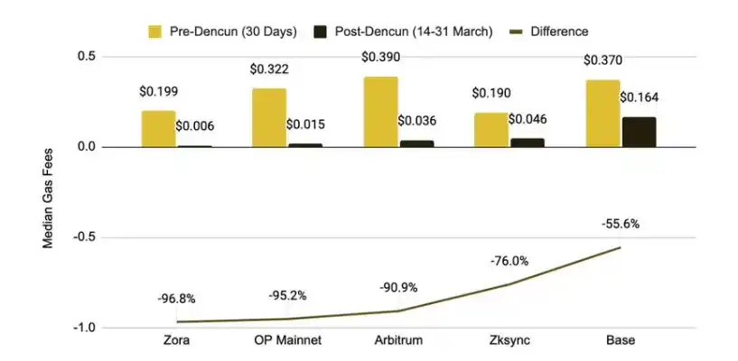 Blob 的实施使交易成本大幅下降,原因在于每字节的存储成本**以及每个区块容量的扩展,因为 Blob 与以太坊交易不争夺 Gas,并且不会**存储,在大约 18 天后会从区块链中删除。