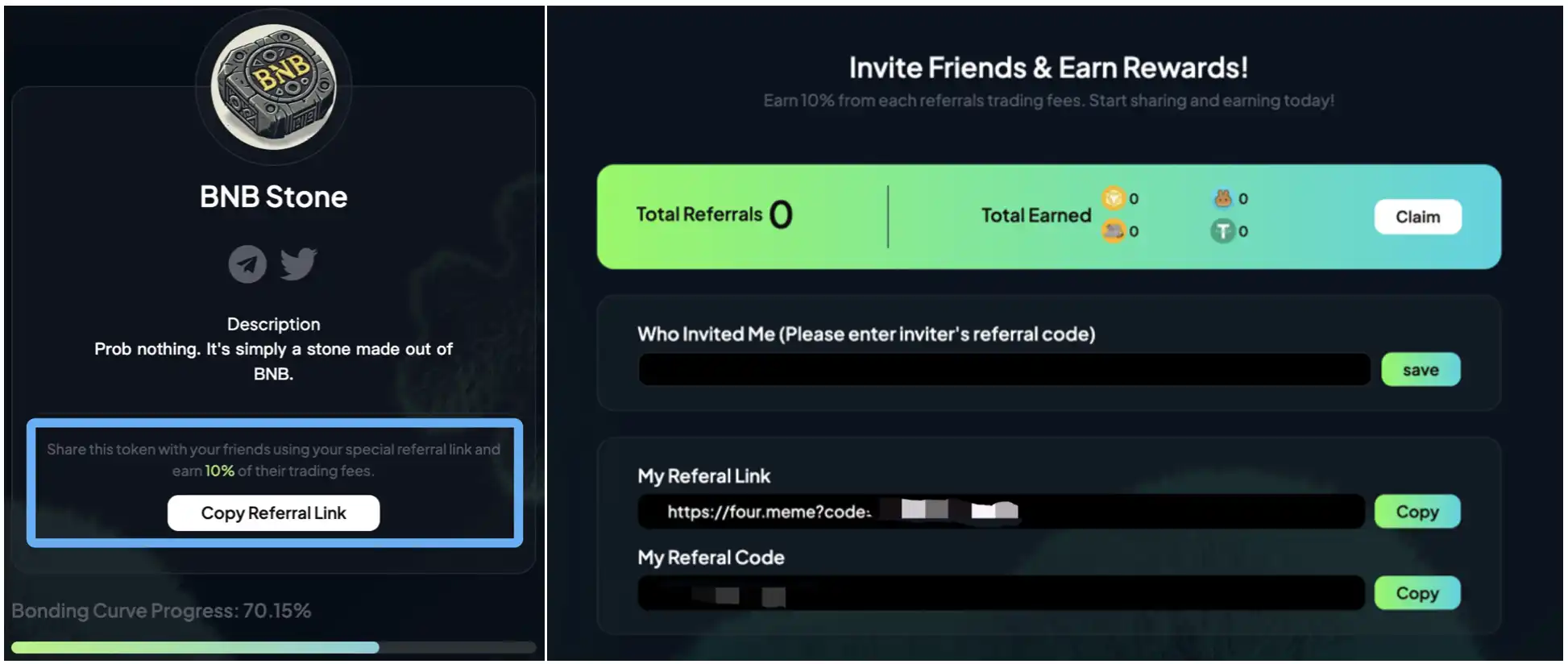 另外,目前在 Four.meme 上的每一个**都有推荐链接,交易者将自己的链接向外分享**之后,就可以赚取被推荐者交易费用的 10%。