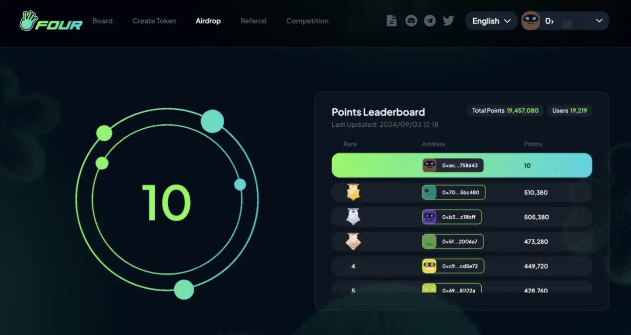 自 8 月 21 日至 10 月 20 日,Four.meme 平台用户可以参与 Season 1 积分活动,每日登录、进行交易、邀请他人交易都可以获得平台积分。根据平台介绍,这些积分可以兑换为 USDT 和与 Four.Meme 有战略合作关系的 meme **,比如$FOUR 和$WHY 等已经具有社区影响力的 meme 币。