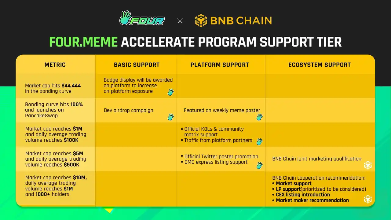 在 Four.meme 上的 meme 币市值达到$5M 以上后,会直接获得来自 BNB Chain 的联合营销**,得到 BNB Chain 官方的品牌背书和更广泛的资源对接。当市值达到$10M,日均交易量达到$1M 且持有者超过 1000 人后,BNB Chain 将与 meme 项目进行更深度的合作,在市场支持、流动性提供、CEX 上市引荐和市场做市商推荐等环节提供帮助,助力 meme 币走完「出圈留名前的**一站」。