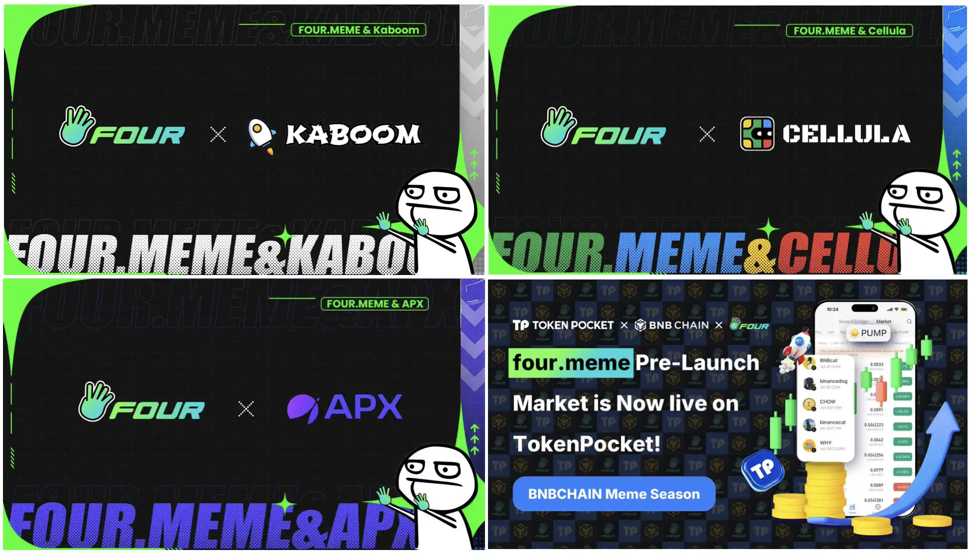 而当 meme 市值达到$1M 且日均交易量达到$100K 时,meme 币可以享受到官方 KOL 伙伴和社区矩阵的支持,另外 Four.meme 现在已经与多个项目方达成合作关系,如多链钱包 TokenPocket、衍生品 DEX APX Finance、游戏化交易应用 Kaboom.meme 以及 Cellula 等,平台合作伙伴也会为其进行宣传,帮助导入额外流量。