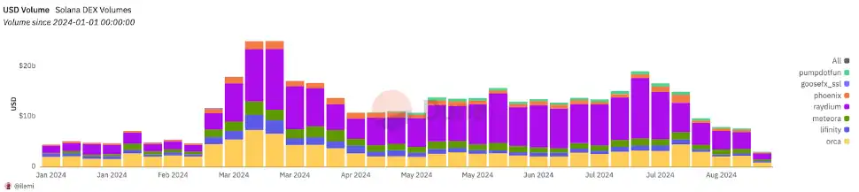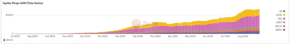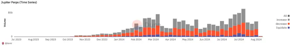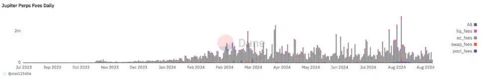 我们看到 Jupiter Perps 的交易量和 Solana 上 DEX 的交易量在趋势上类似,但是明显有更强的独立性,在 7 月开始交易量大幅走低的情况下,Jupiter Perps 的交易量依然维持在了一个不错的水平。