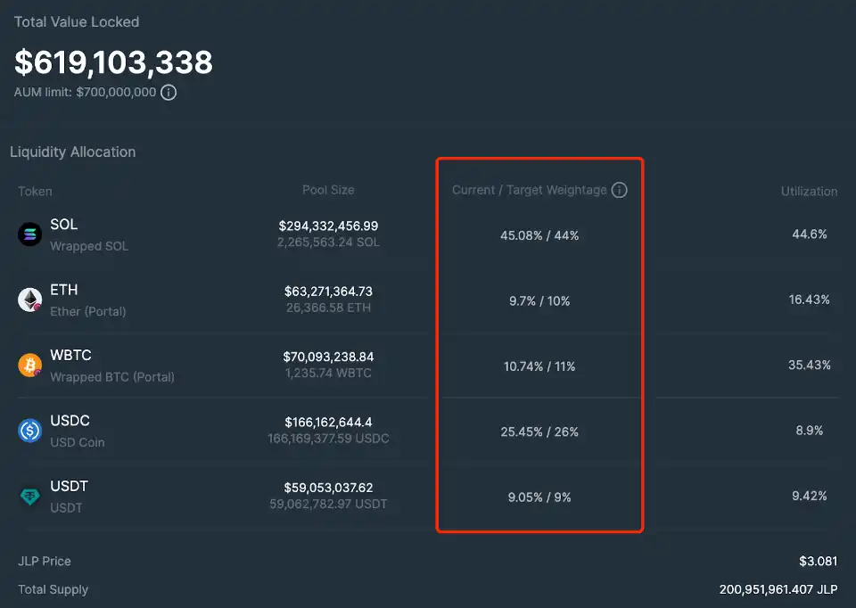 JLP 是 Jupiter Perp 的流动性池,池子内的资产由 SOL, WBTC, ETH, USDC,USDT 构成, **的构成比例是这样的。
