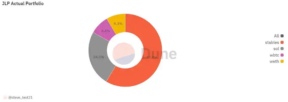 我们可以从这里轻松得到当前 JLP Pool 的基础数据。根据我们的数据分析,当前的真实稳定币占比为 58.8%。这也是为什么我们看到 JLP 的价值如此稳定的核心原因,当组合中有 60% 的稳定币时,它的价值很难不稳定。