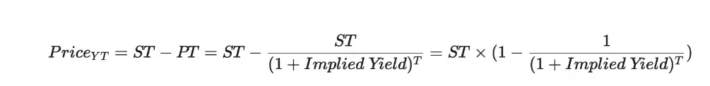 这是一个非线性的公式,看起来不直观。当 implied yield 越小的时候,你可以粗略认为 YT 价格的变化率和 Implied Yield(APY)的百分比变化率一样。(例如半年到期的合约,implied yield 从 3% 变成 4% 的时候,YT 价格变化大概是 4%/3%-1=33%,当从 30% 变到 40% 的时候,YT 价格变化百分比大概是 26%,这里有一个折现因子敏感度的问题)。如果你是一个成熟的投资者,我们还是建议你自己算一下会比较**。这里有个很详细的针对 YT 的说明。