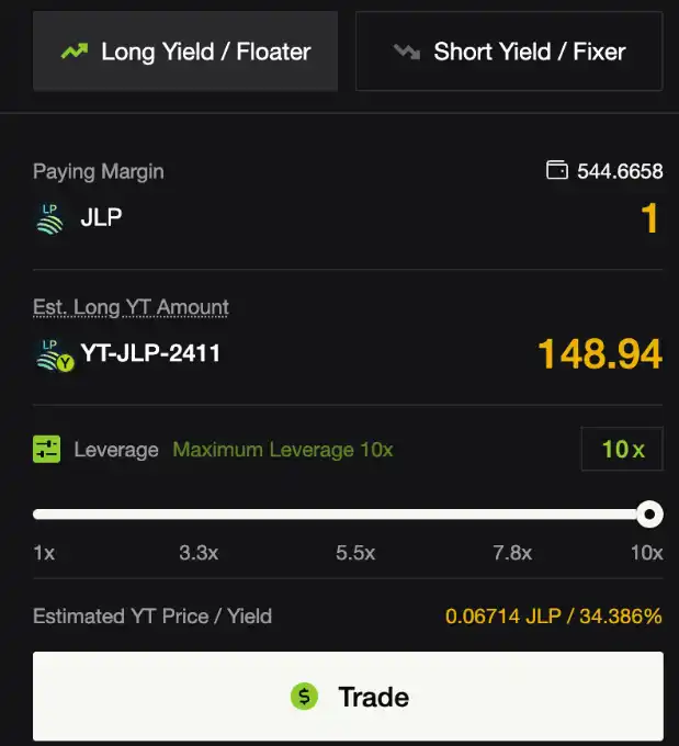 在 RateX 测试网的 JLP-2411 合约(24 年 11 月底到期)中,存入 1 JLP 的保证金,可以买到 148.94 个 YT-JLP-2411。