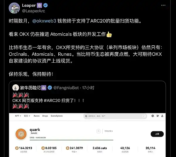 ● OKX @okxweb3 钱包支持了 ARC20 的批量扫货功能。Atomicals 板块的开发工作继续推进。@LeaperArc