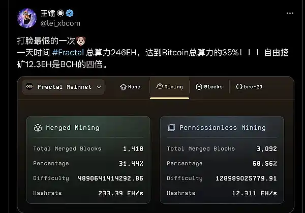 一天时间 #Fractal 总算力 246EH,达到 Bitcoin 总算力的 35%!自由挖矿 12.3EH 是 BCH 的四倍。