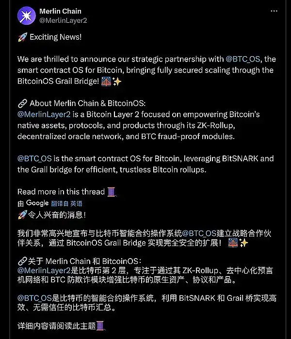 Merlin 与 BTC_OS 合作,通过 BitcoinOS Grail Bridge 和 BitSNARK 技术实现比特币的安全扩展,推动无需信任的跨链安全,革新 Layer 2 Rollups 的安全性。