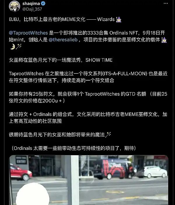 女巫师 @TaprootWitches 是一个即将推出的 3333 合集 Ordinals NFT,9 月 18 日开始 mint,创始人 @theresalieb。by @Daji_357