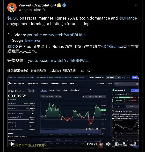 ● $DOG 将在 Fractal 主网上,Runes 75% 比特币主导地位,@Binance 参与 Farming 或暗示未来上市。$DOG 今日涨幅 5%。