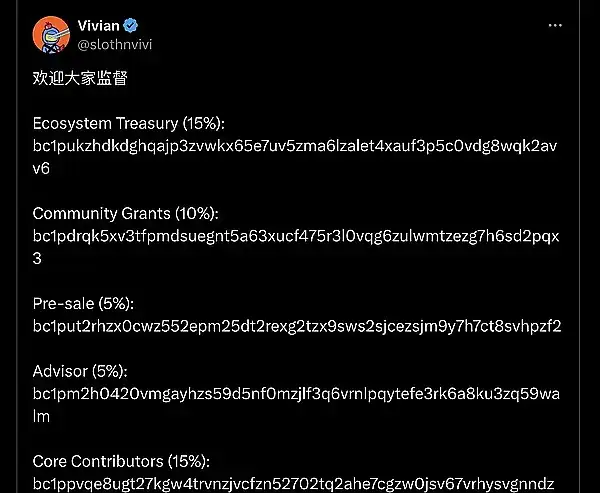 Core Contributors (15%): bc1ppvqe8ugt27kgw4trvnzjvcfzn52702tq2ahe7cgzw0jsv67vrhysvgnndz