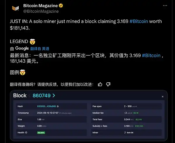 ● 一名独立矿工刚刚开采出一个区块,其价值为 3.169 #Bitcoin,181,143 美元。最近经常出现独立矿工出块,幸运儿舒服了?