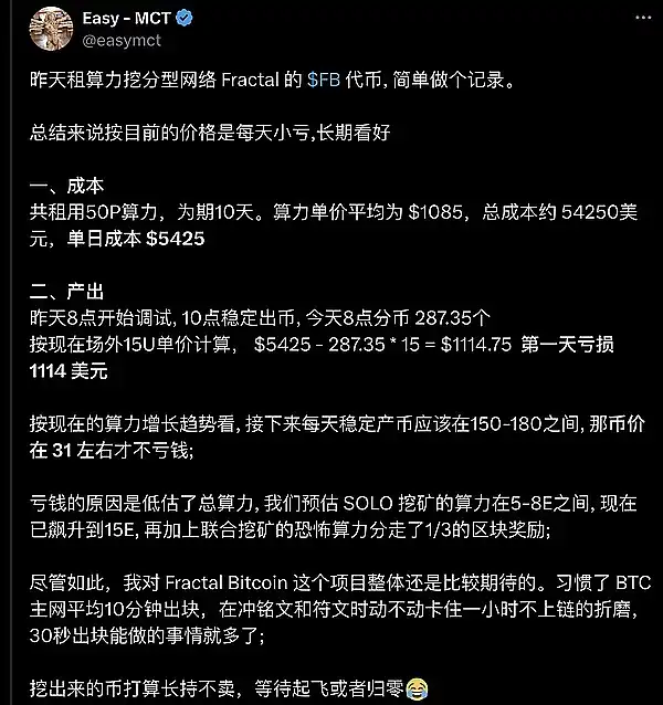 挖矿 $FB 成本计算实例,产出感人。租用了 50P 的算力来挖 Fractal 网络的 $FB **,租期为 10 天,总成本约为 54,250 美元,**天亏损 1,114 美元。如算力保持或增长,FB 至少 31u 才不亏钱。但计划持币观望。by @easymct