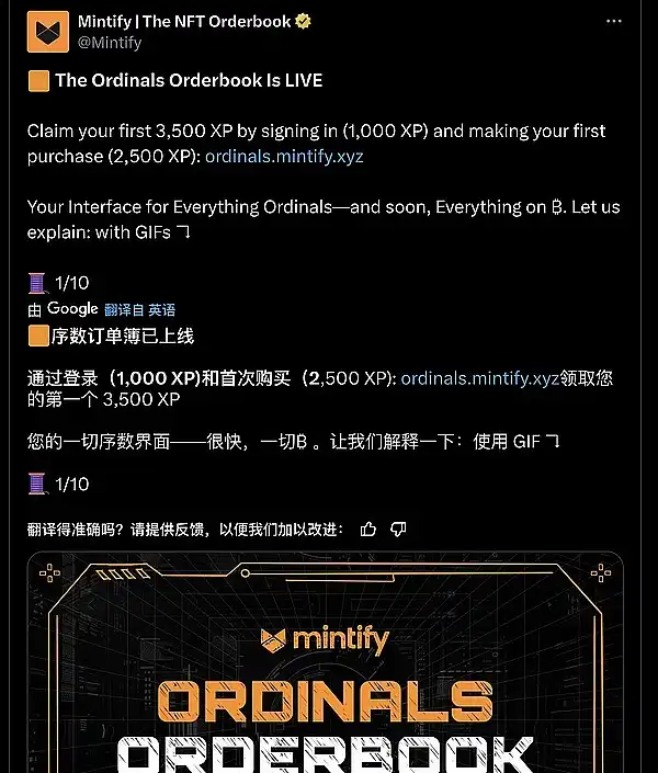 ● Ordinals 交易平台 @Mintify 订单簿已上线,通过登录(1,000 XP) 和**购买(2,500 XP): 目前可使用 @xverse 登陆,ordinals/mintify/xyz 领取您的**个 3,500 XP。积分将在未来可兑换平台 Token。