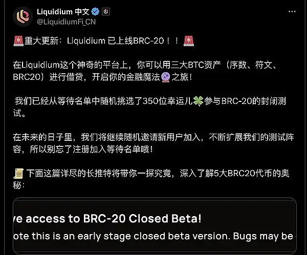 ● 借贷平台 Liquidium @LiquidiumFi_CN 已上线 BRC-20,包括 $ORDI、$SATS、PIZZA、$TRAC。