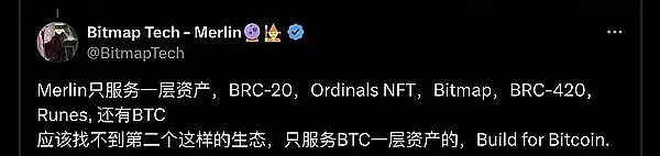 Jeff 表示,Merlin 只服务一层资产,BRC-20,Ordinals NFT,Bitmap,BRC-420,Runes, 还有 BTC,应该找不到第二个这样的生态,只服务 BTC 一层资产的,Build for Bitcoin。