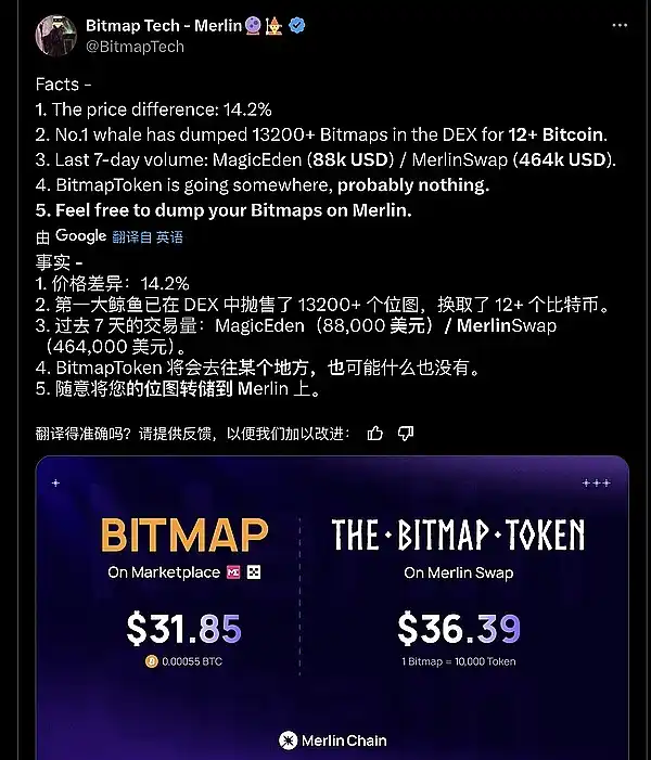 ● Bitmap 在 Merlin @MerlinLayer2 溢价超 14.2%。大户换手剧烈。