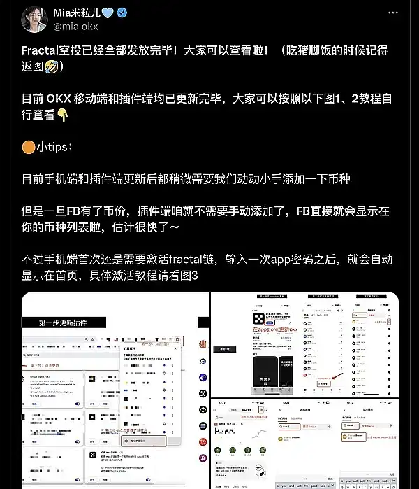 ● Fractal @fractal_bitcoin 主网启动计划**奖励已**分发完毕!OKX 方面可升级 App 至 V6.84.0 版本,进入钱包首页,通过币种管理搜索并添加 "FB" 即可查看**。钱包中的 $FB 已经显示价格了!快去查看你的钱包吧!by @mia_okx