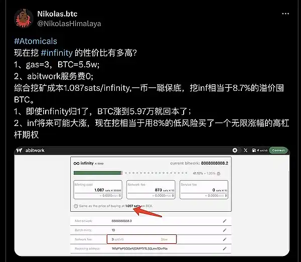 ● 现在挖 Atomicals 的 #infinity 的性价比有多高?综合挖矿成本 1.087sats/infinity, 一币一聪保底,挖 inf 相当于 8.7% 的溢价囤 BTC。by @NikolasHimalaya