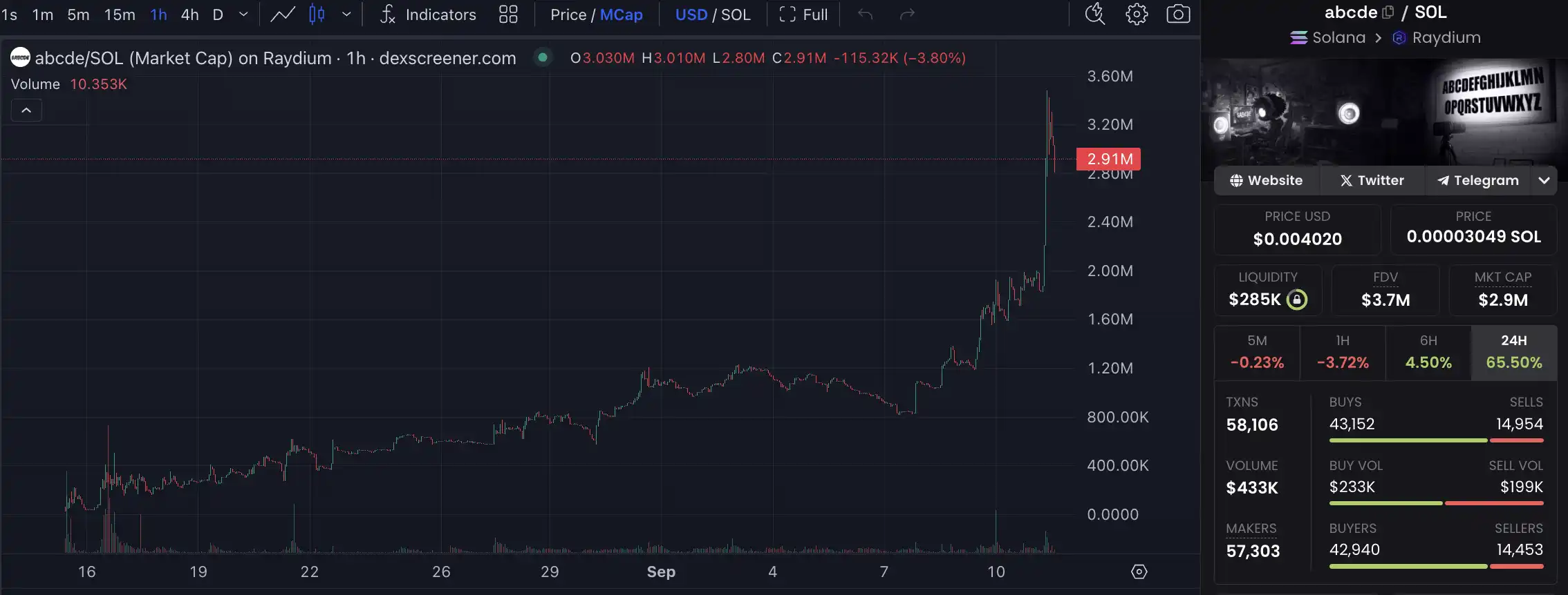 BlockBeats 在今日更新的《Alpha 早报|9 月 11 日你需要知道的所有市场动向及资讯》中提到了 meme 币$abcde,其上线不到一个月涨幅超 50 倍,近四天涨幅达 3 倍,**市值 340 万美元。
