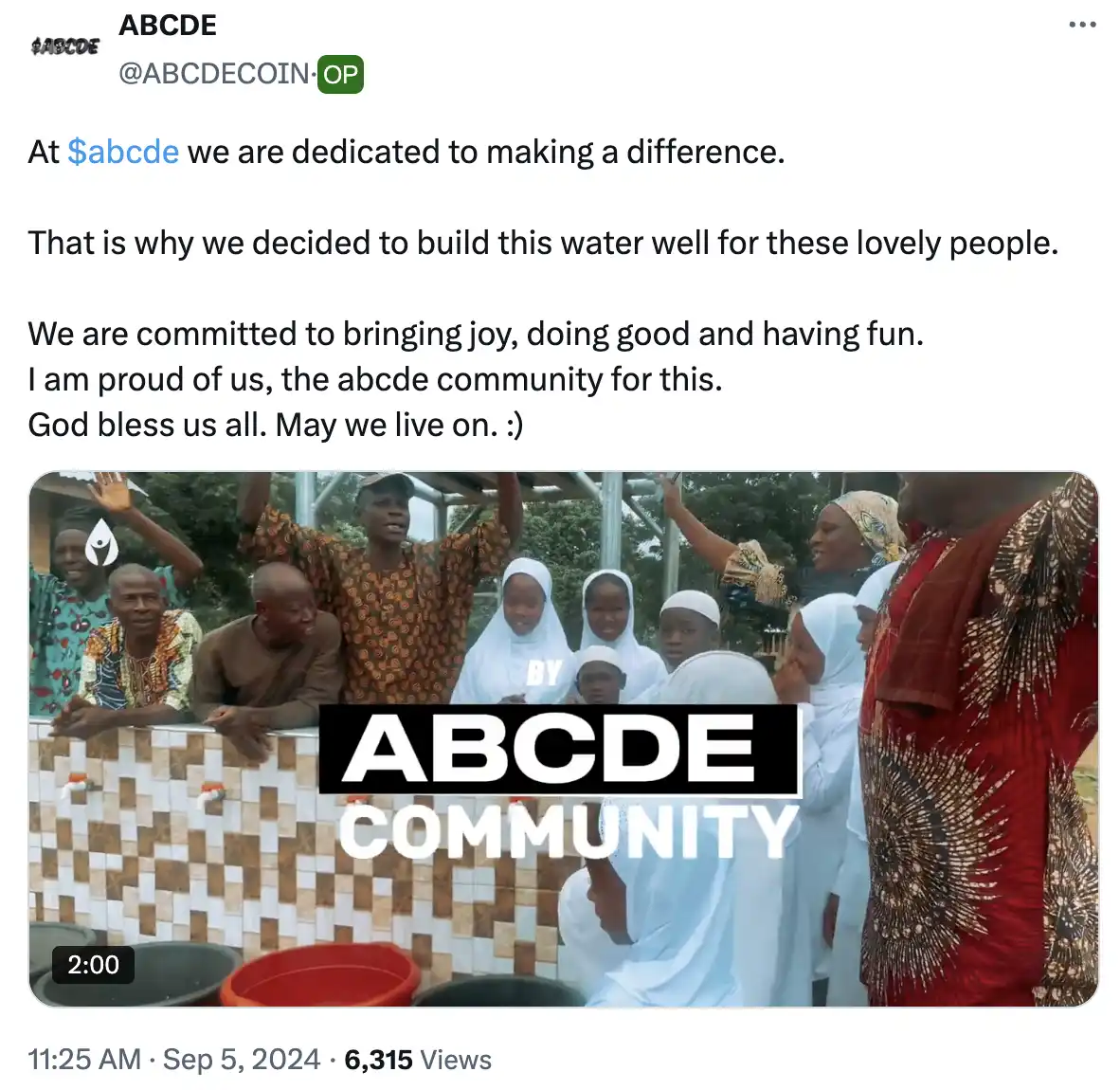 这些「业务」主要是向持有者展示项目方回购**的资金来源,除此之外,abcde 还推进了慈善工作,与比特币曼德拉基金会合作在尼日利亚的一个村庄捐了一口水井,为当地居民提供了未来 30 年的饮用水。在文档中,abcde 还表示将在未来继续实现翻修学校、赞助运动队等慈善举措。