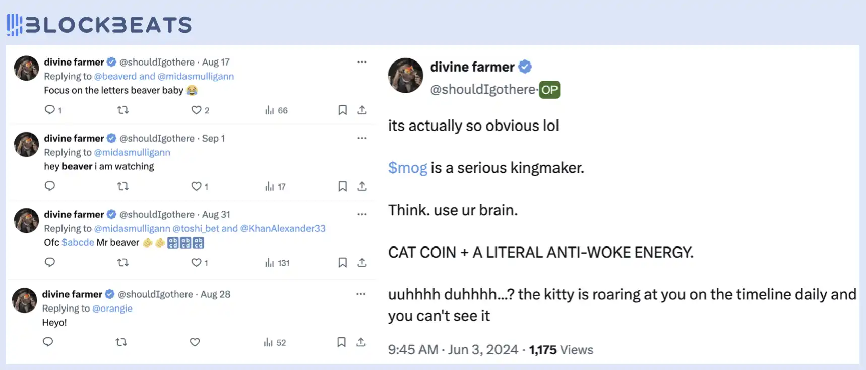 BlockBeats 从这些喊单者的 KOL 互动区发现了 abcde 开发者 divine farmer(@shouldIgothere)的身影,在这些 KOL 发布相关推文之前几天,divine farmer 多次在他们的评论区推荐 abcde,并希望加入 @orangie 的社群。