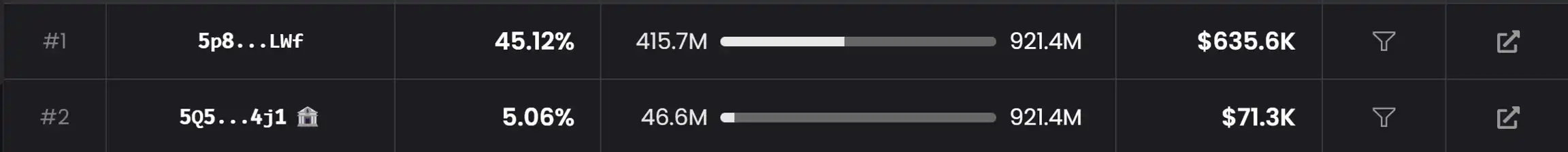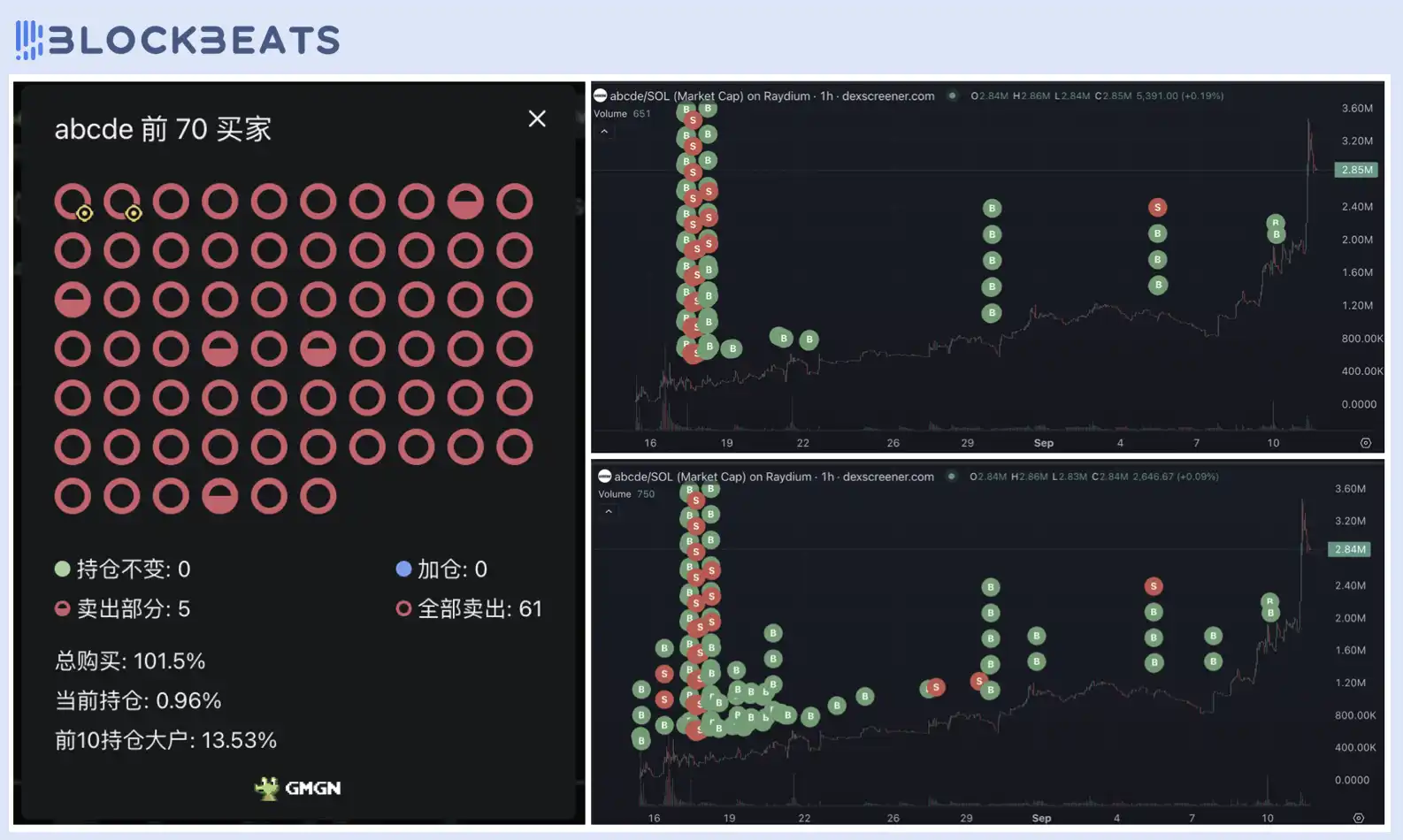 根据 gmgn 和 Dexcreener 数据显示,abcde 的前 70 买家中已有 61 个交易者**卖出,当前持仓份额为 0.96%。目前**买入的大户地址为 AyXeD...Emh 和 7QpAx...dya。二者均为 abcde 的早期买家,在早期入场获利后快速退出,之后分批加仓。昨日 abcde 24 小时拉升 80% 之前,这两个地址也都各有两笔加仓操作。